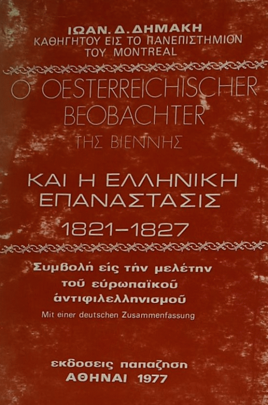 Ο Oesterreichischer Beobachter της Βιέννης και η ελληνική επανάστασις, 1821-1827 συμβολή εις την μελέτην του ευρωπαϊκού αντιφιλελληνισμού / Ιωάννου Δ. Δημάκη.