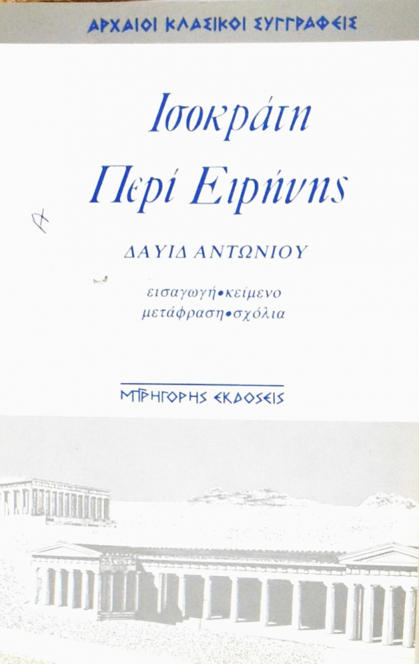 Ισοκράτη περί ειρήνης / Εισαγωγή - κέιμενο - ματάφραση - σχόλια γραμματικά - συντακτικά - ερμηνευτικά - πραγματικά - αισθητικά υπό Δαυίδ Αντωνίου.