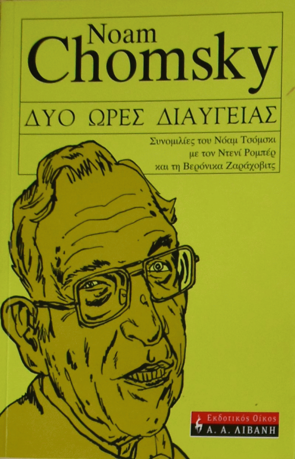 Δύο ώρες διαύγειας : συνομιλίες του Νόαμ Τσόμσκι με τον Ντενί Ρομπέρ και τη Βερόνικα Ζαχάροβιτς : Σιένα, 22 Νοεμβρίου 1999 (συμπληρωματικά κείμενα μέσω e-mail Παρίσι-Βοστώνη) / Νόαμ Τσόμσκι ; μετάφραση από τα γαλλικά Αργύρης Αργύρογλου.